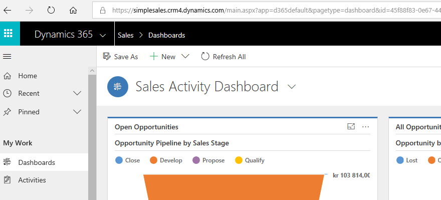 Start off by opening your dynamics url. My url in this case is https://simplesales.crm4.dynamics.com .