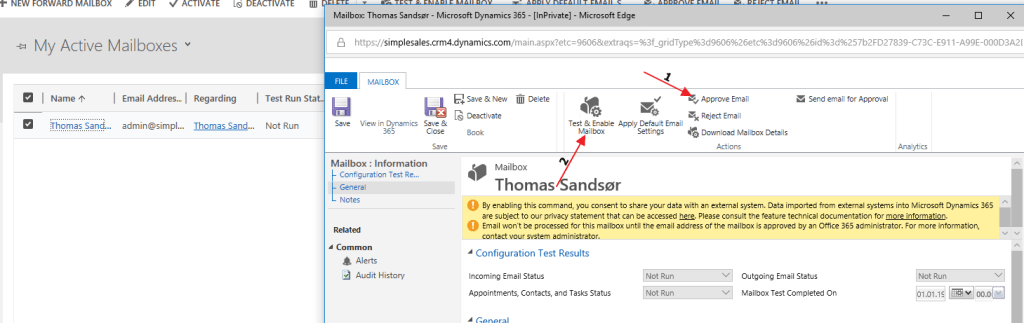 Open the record in view. First you need to approve the email (has to be done by the global administrator). Then you can “Test & Enable” the mailbox.