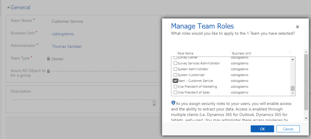 Open teams and create a new team. I will call mine Customer Service. Make sure you assign the security role to the newly created team.
