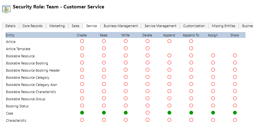 These are the entities that I needed to make my scenario work. It is a very minimal role, but I won’t be needing more than this for Customer Service Team.