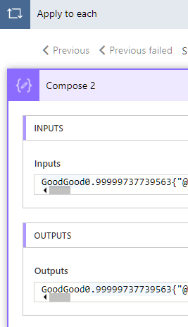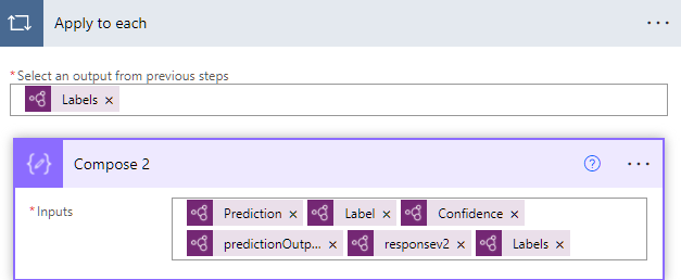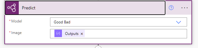 The prediction on the other hand worked out really nice!! I found my model that I had imported from Lobe, and used the ouputs from the Compose 3 action (base64 to binary). I have no idea what the differences are, but I just acknowledge that this is how it has to be done.. I am sure there are other ways, but that someone will have to teach me in the future.