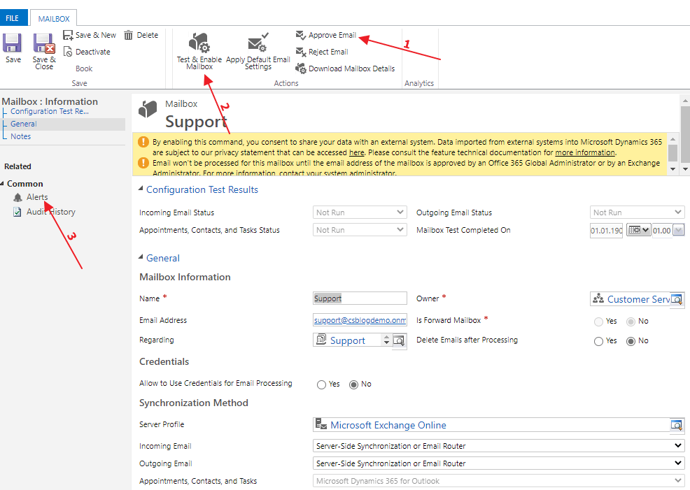 Your picture should look something like below. Following order 1. Approve Email – You must be global admin to do so. 2. Test & Enable Mailbox 3. Follow progress in Alerts