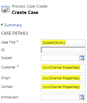 When you created the role for creation of case, it would use the following standard setup. Notice that the contact here would be set if account and contact were known. Contact would be contact, and account would be customer.