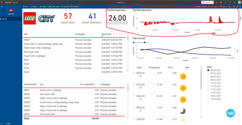 We included Dynamcis 365 information on the left to give a status on all ongoing city work orders (fixing problems), and on the right side we had live data from the mountain. One of the charts were showing the constant temperature, and others were measuring movement. Below we connected to the Norwegian weather API, so that we could understand what potential conditions would effect our emergency response the next days.