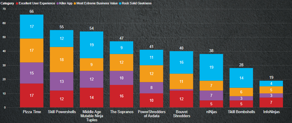 Teams were from: Point Taken (Point Taken Brixters) Avanade (Orange Panthers) Albatross (The Merge Conflict) Skill (Klossmajorene) Felleskjøpet (Cowders)
