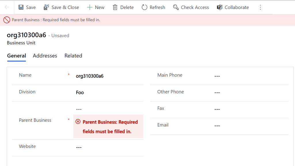 This can result in the following main Business Unit, and it just doesn’t make any sense. Also you can’t change it because Parent Business needs to be entered. Problem is that there is no parent to the parent in this case 🤣